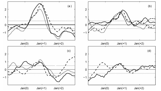 图 1 强(a)、中等(b)、较弱(c)和弱(d)El Niño的演变过程(单位:℃,不同线型表示不同的El Niño事件) (unit:℃,Different-style lines mean different El Niño events) Fig. 1 The evolution of the strong (a), moderate (b), relatively weak (c) and weak (d) El Niño |