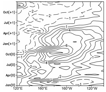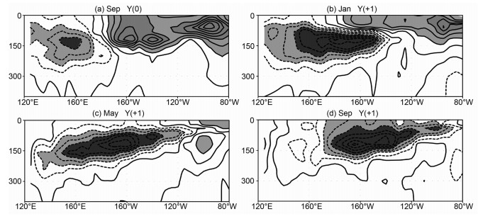 在强El Niño中,热容量负异常有三个明显的阶段性特征(图 3):第一阶段为0年5~9月,负异常首先在WNP出现并持续增强和向赤道扩展;第二阶段为0年11月至+1年1月,即El Niño盛期,负异常沿南赤道辐合带向赤道以南扩展,东边界达到日界线以东;在第三阶段,即+1年3~11月,随着El Niño盛期的结束,负异常在WNP区域迅速衰弱并消失,其主体沿赤道偏南缓慢东移,至年底到达中东太平洋.这种负异常信号的传播特征与Guilyardi和Delecluse[20]的研究结果基本吻合.出于简化和与前文保持一致,这种复杂的西太平洋负异常信号传播,我们依旧称之为信号东传.