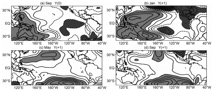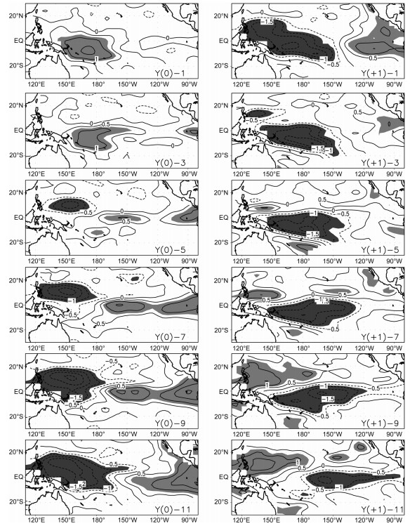 图 5 强El Niño中海平面气压异常随时间的变化 等值线间隔0.5 hPa,强度大于1.0 hPa的正负异常区域分别用浅灰、深灰色标记. Fig. 5 The evolution of sea level pressure anomalies for the strong El Niño The contour interval: 0.5 hPa, areas with intensity more than 1.0 hPa are shaded with light and heavy grey, respectively. |