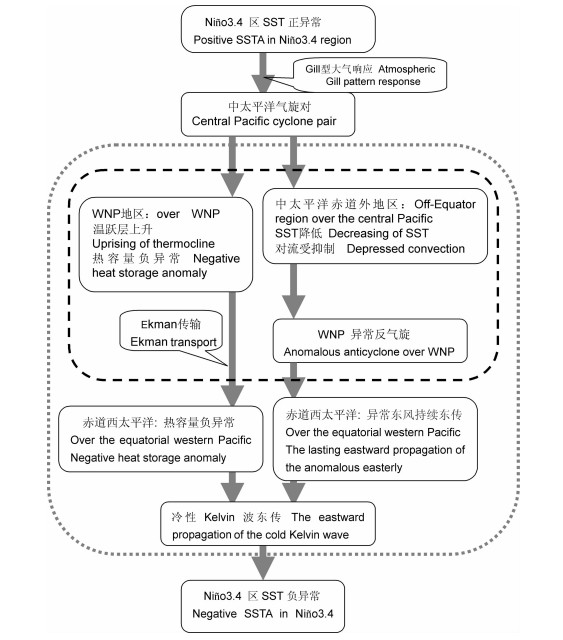 6.3 强El Niño衰减的物理过程在以上分析基础上,我们可以认为,强El Niño衰减的主要过程如下(图 6):赤道中东太平洋海水增暖通过Gill型响应激发中太平洋异常气旋对;后者通过Ekman效应减小WNP的热容量,抬升温跃层,还可以通过增强赤道外信风增强局地的蒸发,从而使得当地海表温度降低,对流受抑制,进而通过Gill响应引起WNP异常反气旋,后者通过局地海气相互作用长时间维持和缓慢东移,造成其南侧赤道东风异常缓慢东扩,赤道东风异常的维持和东扩持续激发Kelvin波,携带自WNP传入赤道的热容量负异常东传,最终导致赤道中太平洋出现La Niña.