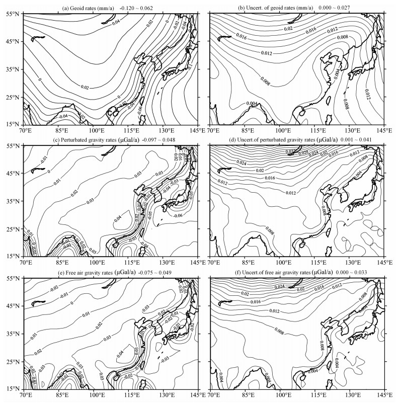 图 1 RF3L20(β=0.4)+ICE-4G GIA模型预测的东亚长期重力变化(a,c,e)及其不确定性(b,d,f) (a)和(b)是大地水准面变化速率的结果; (c)和(d)是扰动重力变化速率的结果; (e)和(f)是自由空气重力异常变化速率的结果.结果的数值范围在子标题后.单位对(a)和(b)是mm/a,其他为μGal/a. Fig. 1 Secular gravity rates (a, c, e) and the uncertainties (b, d, f) in East Asia predicted from RF3L20(β=0.4)+ICE-4G GIA model (a) and (b) are the results for geoid rates, (c) and (d) are for perturbed gravity rates, (e) and (f) are for free-air gravity rates. The range of the results can be found following the captions of the panels. The units are mm/a for (a) and (b), μGal/a for others.