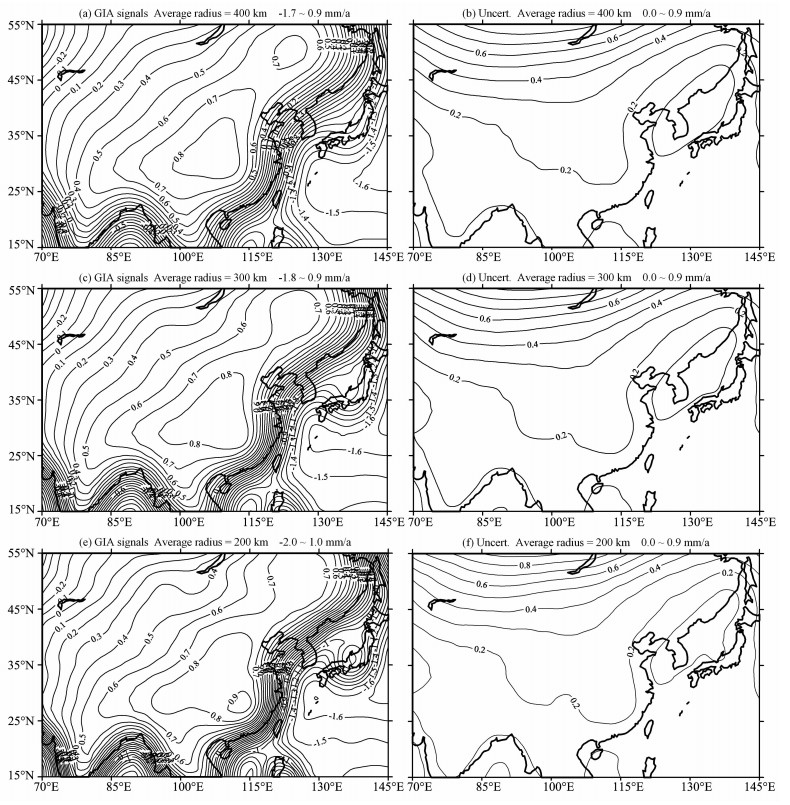 图 2给出了东亚GIA重力场反演的等效水柱变化结果.总体上看,对不同的平均半径,等效水柱变化及其不确定性都与GIA重力场变化本身(图 1c1d)的形态相似.从图 2a图 2c图 2e,在几乎整个东亚大陆,GIA对水质量的影响是正的,幅度一般大于0.2mm/a,从中国东北到东部、特别是华南是影响幅度较大的地区,对400km、300km、200km平均半径,最大影响幅度分别为0.9mm/a、0.9mm/a、1.0mm/a; 在海洋区GIA等效水柱变化的结果是负的,幅度一般大于0.5mm/a,中国台湾岛和日本约为1.0mm/a,幅度向太平洋深处增大,最大幅度分别为1.7mm/a、1.8 mm/a、2.0 mm/a.从图 2b图 2d图 2f,等效水柱变化的不确定性随平均半径的变化也不大,在东亚大陆北部不确定较大,幅度在贝加尔湖同纬度地区达0.9mm/a,但在45°N以南的大陆地区,不确定性向南从0.4 mm/a递减到0.1mm/a,等效水柱变化预测大于不确定性,例如华南等效水柱变化预测为1.0±0.2mm/a.在海洋区等效水柱变化远大于其不确定性.