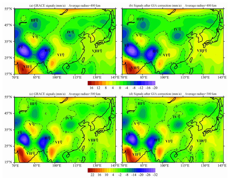 图 3给出了GRACE重力数据反演的等效水柱长期变化和进行GIA改正的结果.图 3(a,b)、图 3(c,d)分别是400km、300km平均半径的结果,可以看出,较大的平均半径具有相对较小幅度的结果,但它们数值异常的分布特征是类似的,因此,我们以300km平均半径的结果为例说明.由图 3c可知,GRACE反演的等效水柱长期变化主要有4个负异常、4个正异常,一般分别说明水量(也包含冰雪冻土)减少和增加.下面阐述异常分布与幅度,结合图 2c,给出GIA的影响.