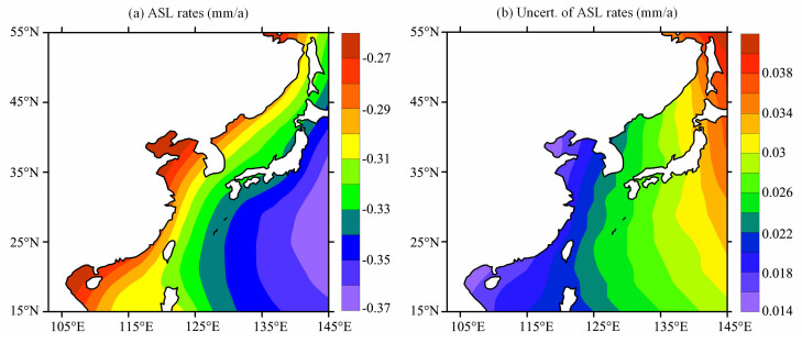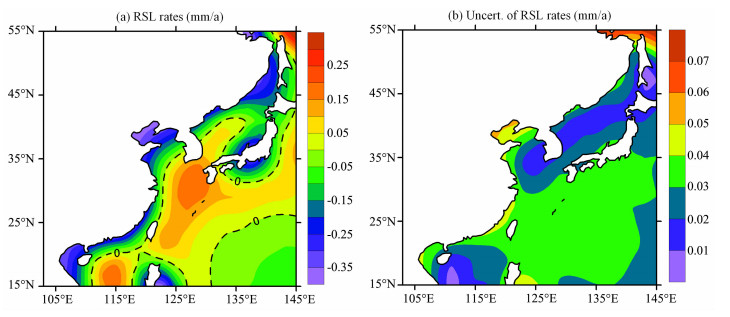 图 4 RF3L20(β=0.4)+ICE-4G GIA模型预测的东亚现今绝对海平面变化 (a) ASL速率; (b) ASL速率的不确定性.单位均为mm/a. Fig. 4 Present-day Absolute Sea Level (ASL) changes in East Asia predicted from RF3L20(β=0.4)+ICE-4G GIA model (a) ASL rates; (b) The uncertainties. The units are mm/a.