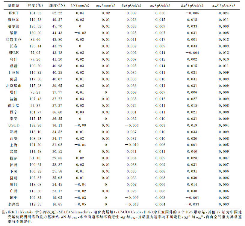 表 1 东亚大地测量观测站GIA重力场长期变化预测结果 Table 1 Predicted secular changes of geoid (δN), gravity (δg & ΔgF) and their uncertainties (σδN, σδg, σΔgF) due to GIA at geodetic stations in East Asia