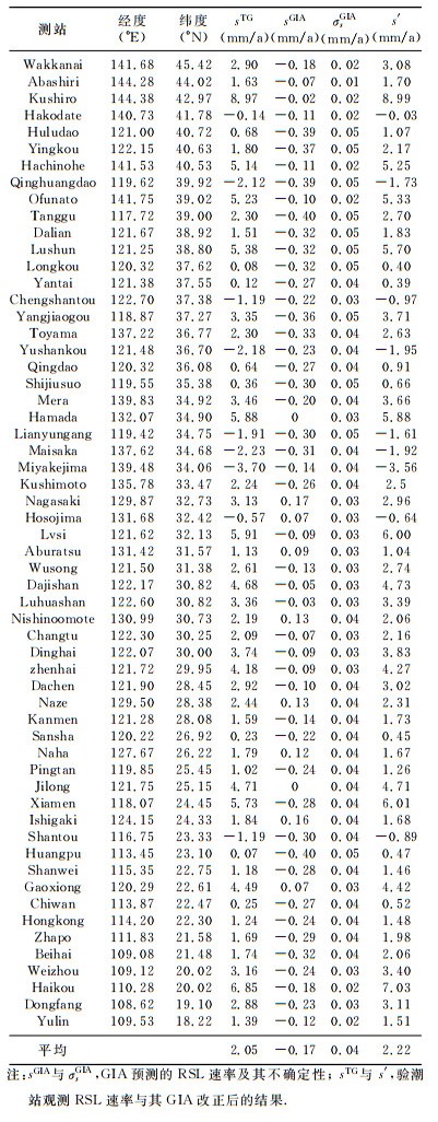 为研究GIA对海岸RSL长期变化的影响,如表 2所示,我们比较东亚57个验潮站GIA RSL速率和几十年的RSL长期变化的观测结果[37].从所有站的平均结果看,东亚地区验潮站总体RSL上升速率为2.05mm/a,其中GIA使RSL下降0.17mm/a,经过GIA改正后的验潮站总体RSL上升速率为2.22mm/a,GIA相对影响8.3%.从个体测站看,GIA使RSL下降0.3~0.4mm/a的有14个测站,下面列出其GIA改正后的RSL长期速率(GIA相对观测的影响),葫芦岛1.07mm/a (57.3%)、营口2.17mm/a (20.6%)、秦皇岛-1.73mm/a (18.4%)、塘沽2.7mm/a (17.4%)、大连1.83mm/a (21.2%)、旅顺5.7mm/a (5.9%)、龙口0.4mm/a (400%)、羊角沟3.71 mm/a (10.7%)、Toyama2.63mm/a (14.3%)、石臼所0.66 mm/a (83.3%)、连云港-1.61mm/a (15.7%)、Maisaka -1.92mm/a (13.9%)、汕头-0.89mm/a (25.2%)、北海2.06mm/a (18.4%).