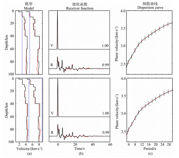 4 数值检验表 1给出了对本文方法数值检验所用的接收区模型.反演中它将被细化为2km层厚的层状模型.壳幔界面的深度假定为40km.接收区以外的地球介质采用PREM模型[40].我们假定震中距为40°,震源深度为20km.与模型相应的“真实”接收函数和瑞雷波相速度频散由本文的正演算法得到.接收函数的先验均方根误差为谱振幅的1%,各周期相速度的先验均方根误差为0.05km/s.