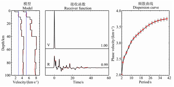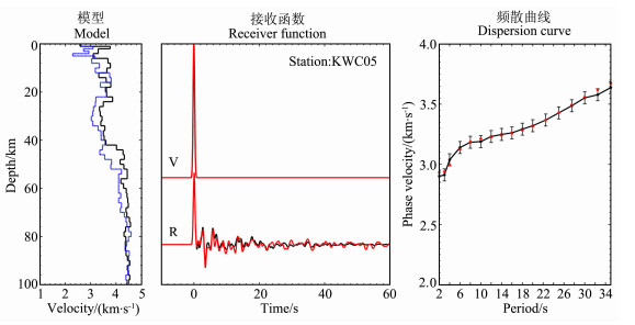 图 6给出了利用本文方法得到的反演结果.图 6表明,无论接收函数,还是环境噪声的相频散数据都得到了很好的解释.台站KWC05下方100km深度范围内的地壳上地幔S波速度结构表明,其地壳厚度为44km,上地壳为高速结构,而深度24~42km的中下地壳形成了相对的低速区.我们的重新解释结果表明,台站KWC05下方地壳的平均泊松比为0.262,壳内低速区泊松比为0.270.