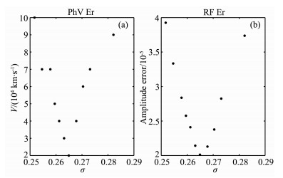 图 4 接收函数(b)及瑞雷波相速度(a)拟合误差随地壳泊松比σ的变化 Fig. 4 Variations of fitting errors of the receiver function (b) and phase velocity (a) with averaged Poisson′s ratio over the crust |