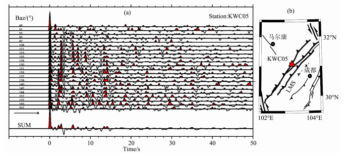 图 5 台站KWC05不同方位的接收函数 (a)接收函数,Baz为台站方位角(单位:(°)),SUM表示叠加平均; (b)台站位置,LMS表示龙门山断裂带. Fig. 5 Receiver functions at Station KWC05 over different azimuths (a) Receiver function; Baz denotes the back azimuth (°); SUM denotes the summation over azimuths.(b) Station map; LMS denotes the Longmen Shan faults. |
