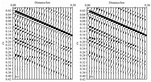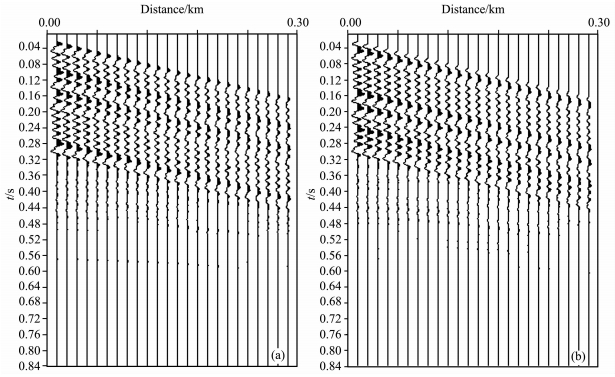 图 2(a,b)是分别用s1(t)和s2(t)作为可控震源的扫描信号所得到的匹配原始地震记录Ra(xi,t)和Rb(xi,t).