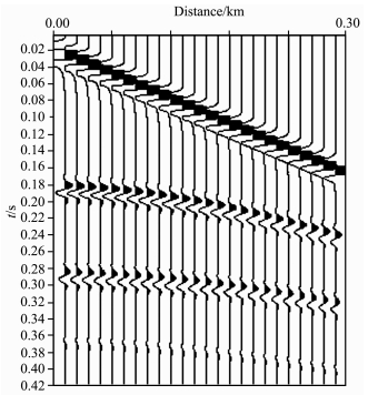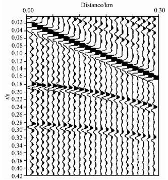 从图 5可以看出,在Chirp扫描的地震响应剖面中,直达波的能量不但很强而且存在着严重的旁瓣,对浅部的反射波影响比较严重.由图 6可见,基于二元伪随机编码扫描的地震响应剖面中旁瓣干扰相对图 5而言得到了有效的压制,但是相关噪声的能量很强,多次波几乎被能量很强的相关噪声所淹没.