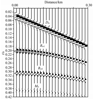 首先来看可作为衡量标准的脉冲震源地震响应剖面(图 7)中的波组分布情况,在图 7中共有4个波组,最上边的波组是直达波(用Dw表示),第二个波组是来自深度为z=180m处的界面的反射波(用Rw1表示),第三个波组是来自深度为z=300 m处的界面的反射波(用Rw2表示),最下边的波组是与自由表面有关的多次波(用Mw表示).可控震源地震响应剖面的优劣均以脉冲震源地震响应剖面作为对比依据.