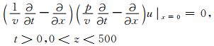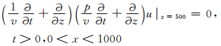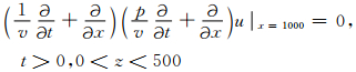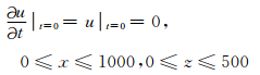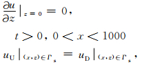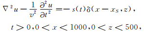 在矩形区域的四个边界上,除了地表z=0为自由边界之外,左边界x=0、右边界x=1000、底边界z=500都是人工截断边界,我们处理成吸收边界,区域内部的岩性分界面(记为ΓS)采用衔接条件.据此,我们建立了如下的二维地震纵波数学模型: