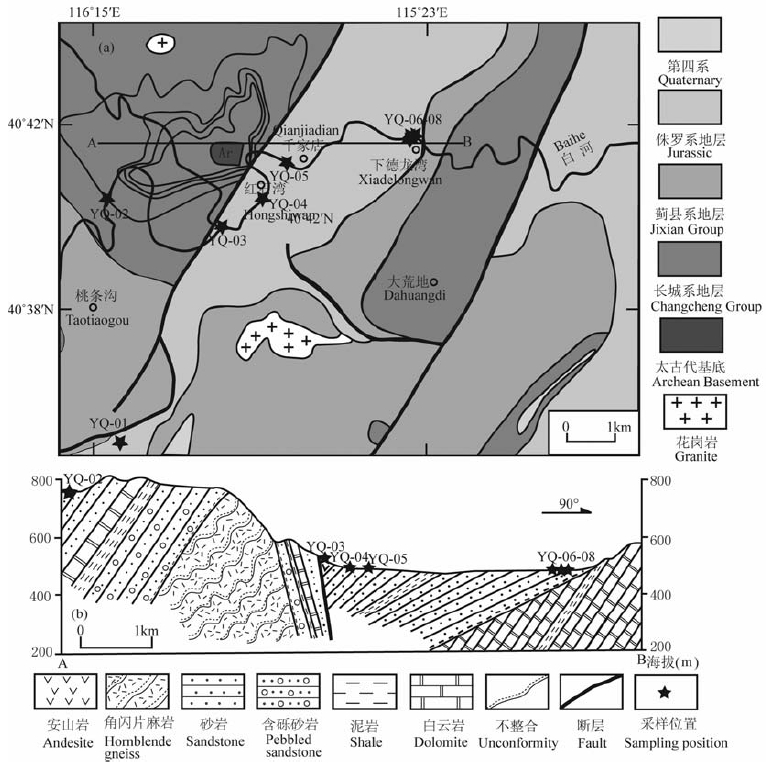 图 1 北京千家店地区地质简图[12](修改自北京市区域地质志,1982) Fig. 1 Geological sketch map of Beijing Qianjiadian area[12] (modified from Regional Geology of Beijing Municipality, 1982) |