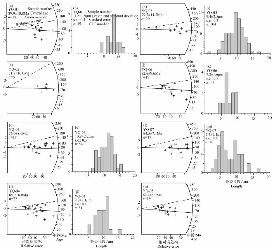 图 2 北京千家店地区磷灰石单颗粒年龄放射图[27]和裂变径迹长度分布图 (a)、(c)、(d)、(f)、(h)、(j)、(l)、(n)分别是样品YQ-01~YQ-08的单颗粒年龄放射图;放射图纵坐标右侧表示绝对年龄,左侧为标准误差,单位σ;图中表示出了中值年龄和样品的沉积年龄;(b)、(e)、(g)、(i)、(k)、(m)分别是样品YQ-01、YQ-03、YQ-04、YQ-05、YQ-06、YQ-07的裂变径迹长度分布直方图,纵坐标表示封闭径迹(CFT)的条数. Fig. 2 Radial plots and track length histograms of apatitesat Qianjiadian area, Beijing [27] Figure (a), (c), (d), (f), (h), (j), (l), (n) are radial plots of single grain age of the samples from YQ-01 to YQ-08, respectively. Vereical ordinate in radial plots denotes absolute age in the right and standard error in the left. Central age and deposition age of the samples are marked in radial plots. Figure (b), (e), (g), (i), (k), (m) are track length histograms of apatite of the samples YQ-01, YQ-03, YQ-04, YQ-05, YQ-06, YQ-07. Vertical ordinate in track length histograms denotes the number of confined fission track (CFT). |