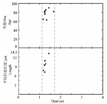 磷灰石裂变径迹的Dpar值可用于区分不同来源磷灰石裂变径迹的热动力群特征[3].Dpar值是平行于磷灰石颗粒结晶C轴的蚀刻径迹开口端的最大直径[28].如图 3所示,千家店地区所测得的磷灰石裂变径迹Dpar值分布在1.18~1.68之间,为氟磷灰石,其Dpar值在误差范围内基本一致,可视为单一热动力群.