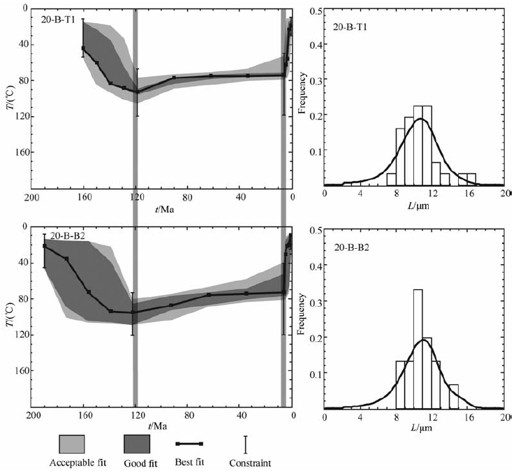 北票盆地是辽西地区最大、发育最为完整的中生代陆内盆地,沉积了巨厚的中生代地层,包含了辽西地区大量的中生代构造岩浆活动信息,成为探讨辽西盆-岭构造格局形成及燕-辽造山带地球动力学背景的重要窗口[35].闫义等[8]对于辽宁北票盆地两件岩石样品磷灰石裂变径迹分析,对北票组样品20-B-B2获得磷灰石裂变径迹年龄为74.35±3.88 Ma,对土城子组样品20-B-T1获得磷灰石裂变径迹年龄为83.61±3.62 Ma,其年龄与千家店地区磷灰石裂变径迹年龄接近.本人对其测量的径迹长度和AFT年龄利用Ketcham等[2, 3]的多组分退火模型和MonteCarlo法进行了磷灰石样品的时间-温度历史的模拟,模拟软件采用AFTSolve [3],得到如图 5所示的T-t热史模拟结果.从图中可以看出两个样品都是从沉积物开始在盆地内部充填直到120 Ma左右,盆地温度持续升高,到120 Ma左右时达到最大温度,表明沉积物持续充填盆地,盆地持续沉降;120 Ma之后温度略有下降,但总体上来讲比较稳定;直到6 Ma左右盆地温度突然下降,表明盆地沉积物迅速上升,最终到达地表遭受剥蚀.所以北票盆地经历的沉积埋藏史与千家店地区经历的沉积埋藏史非常相似,这两个盆地有着相似的构造动力背景.
