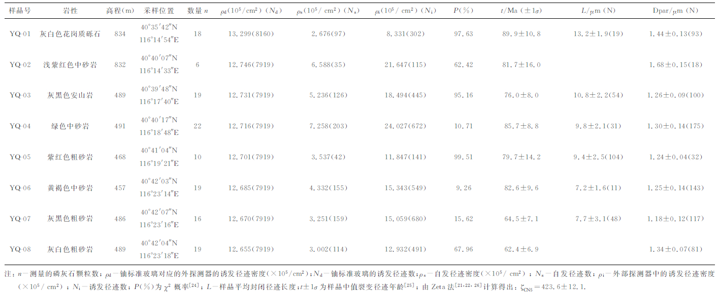 用于磷灰石裂变径迹分析的样品YQ-03、YQ-04、YQ-05采自千家店附近侏罗系后城组上段,YQ-06、YQ-07、YQ-08采自下德龙湾附近侏罗系后城组下段.为了与上述采集样品对照分析,在桃条沟南3km处采集后城组样品YQ-01,在桃条沟北2km处采集长城系大红峪组样品YQ-02.各样品的采样位置如图 1所示,其相关参数见表 1.