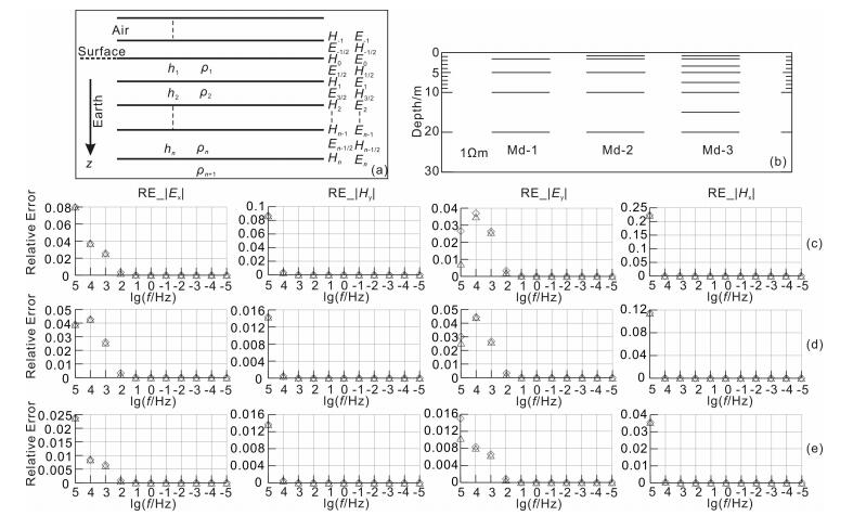Fig. 1 Relative errors of 1-D magnetotelluric fields solved by different methods of half space models in different grid resolutions. (a) A homogenous layered model with different discrete modes; (b) A 1 Ωm half space model divided with different grids respectively (Md-1 has four layers in total, the thickness of first layer is 1.6 m close to the skin depth at frequency 105 Hz; Md-2 is formed by splitting the first layer of Md-1 into two equal layers, so the first layer of Md-2 is 0.8 m; Md-3 is formed by splitting each layer of Md-1 into tow equal layers.); (c) Relative errors of electric and magnetic fields of Md-1. RE _ | Ex |; relative error of | Ex | at earth surface under Ex-Hy mode. RE_ | Hy |; relative error of | Hy | at earth surface under Ex-Hy mode. RE_ | Hy |; relative error of | Hy | at earth surface under Ex-Hy mode. RE_ | Ex |; relative error of | Ex | at the top of second layer under Ex-Hy mode. The diamonds show solutions with normal grid method, the upward triangles show solutions with staggered grid method; (d) Relative errors of electric and magnetic fields ofMd-2; (e) Relative errors of electric and magnetic fields of Md-3 |