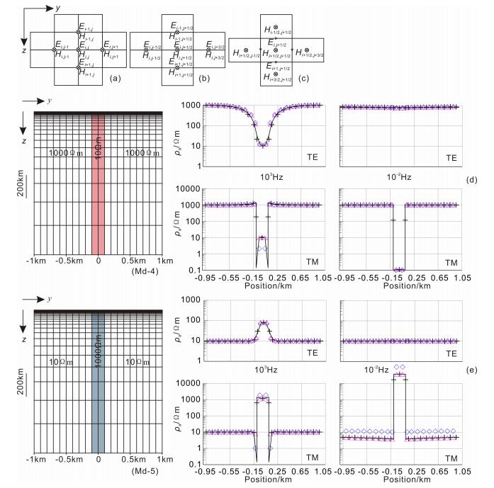 Fig. 2 Comparison of 2-D apparent resistivity curves of two different models with normal grid and staggered grid methods, (a) The primary and auxiliary fields are defined at the same nodes of the retangular blocks, called as normal-node method; (b) The primary and auxiliary fields are defined at the center of the blocks' top edges, called as norma-center method; (c) The primary fields are defined at the center of blocks, while the auxiliary fields are defined along the blocks' edges, called as staggered grids. (d) The apparent resistivity curves of Md-4. Solid line shows analytic solution (obtained according to Refs. [11, 12]), diamonds show solutions with normal-center method, crosses show solutions with normal-node method, the upward triangles show solutions with staggered grids. (e) The apparent resistivity curves of Md-5. |