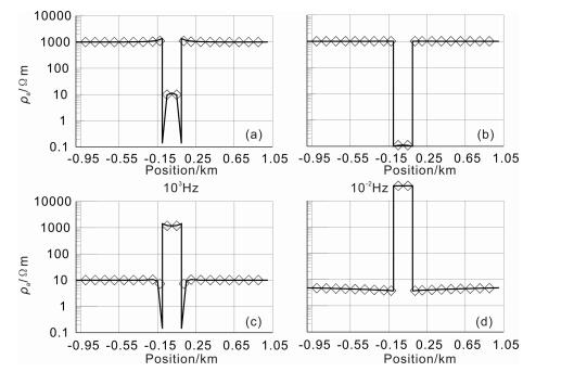 Fig. 3 Comparison of 2-D TM apparent resistivity curves of normal-center method with the difference equation as (7) and the analytic method. (a) The apparent resistivity curves of Md-4 at frequency 103 Hz. Solid line shows analytic solution, diamonds show solutions with normal-center method; (b) The apparent resistivity curves of Md-4 at frequency 10 -2 Hz. (c) The apparent resistivity curves of Md-5 at frequency 103 Hz. (d) The apparent resistivity curves of Md-5 at frequency 10 -2 Hz |