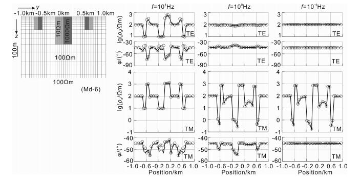 We construct another complex 2-D model as Md-6 m Fig. 4 to have a further test of the normal-center method, the apparent resistivity and phase curves in both TE and TM modes are obtained, and we also calculate the responses with the forward subroutine of NLCG[17]. From the results of three frequencies (as f=104 Hz, 1 Hz, 10-4 Hz) in Fig. 4, the responses of the normal-center method coincide well with the responses of the forward subroutine of NLCG except minor deviation of phase (φ) above the low resistivity abnormities at very high frequency as 104 Hz.