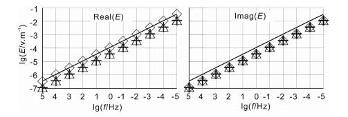 Fig. 5 Comparison of real and imaginary electric fields of both 1-D and 2-D solutions for a 1000 Ωm half space. Solid lines denote 1-D analytic solutions at surface; Diamonds show 1-D numerical solutions at surface; Upward triangles show 2-D numerical solutions under TE mode at surface using 1-D analytic solution as the boundary values at lateral sides; Crosses show 2-D numerical solutions under TE mode at surface using 1-D numerical solution as the boundary values at lateral sides |
