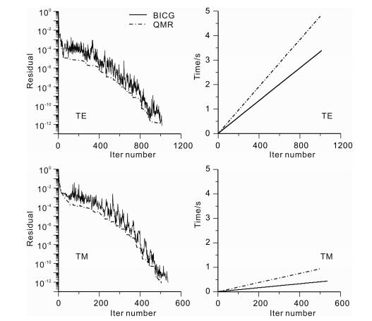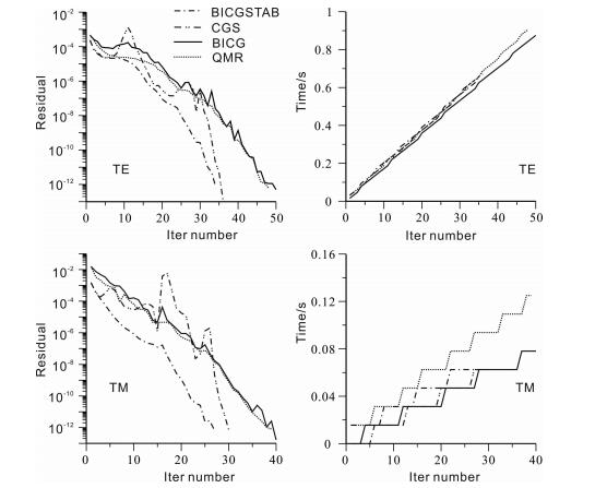 The preconditioned Krylov subspace methods[29] are mostly used in solving MT problems. A good preconditioner is an art when it combines well with the iterative solver[30], which is very essential in 3D MT finite difference forward modeling. For example, Mackie et al. (1994)[6] used incomplete Cholesky decomposition as preconditioner for Minimum Residual (MR) algorithm and Biconju-gate Gradient (BiCG). Smith (1996)[10] found that the incomplete Cholesky preconditioner can accelerate convergence of BICG iterative method. Siripunvaraporn et al. (2002)[8] combined incomplete LU decomposition with the Quasi-Minimal Residual (QMR) method. We make a comparison of the validity of four iterative methods BiCG, QMR, Conjugate Gradient Squared (CGS), and Biconjugate Gradient Stabilized (BiCGSTAB) using a 2-D model as same as Md-4 with a 47 X 36 mesh, the desired residual is 10 -12. A Jacobi precondi-tioner (M is a diagonal matrix, its elements are the diagonal of matrix A.) is used for the four linear solvers, the convergence of both Jacobi-BICGSTAB and Jacobi-CGS are not improved at low frequencies, while Jacobi-BICG and Jacobi-QMR can reach the desired residual. Fig. 6 shows the convergence and consuming time of Jacobi-BICG and Jacobi-QMR in the TE and TM modes at frequency 1 Hz. Though the Jacobi-QMR shows a more smooth convergence than Jacobi-BICG, the former consumes more time per iteration than the latter.