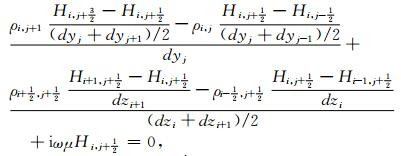 The main difficulty in the normal-center method to solve equation (6) is how to estimate the resistivity at the solution points and the difference of model’s resistivity along the horizontal direction. Although we interpolate the resistivity along y(ρy, horizontal resistivity) and z(ρz, vertical resistivity) respectively for anisotropic model at solution points, t is hard to obtain the accurate difference values of the resistivity as the solution points along the horizontal direction spanning the resistivity boundaries. The accurate responses in the TM mode with the normal-center method can be finally obtained if we use the difference form of equations (1) and (2) at the beginning and form the second order difference equation;