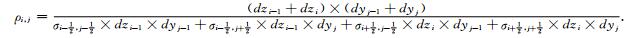 where ρ is the model’ is resistivity at the point defined by ts subscripts, dy is the grid spacing along the horizontal direction, and dz is the grid spacing along the vertical direction. In equation (7), the resistivity at nodes are formed as;