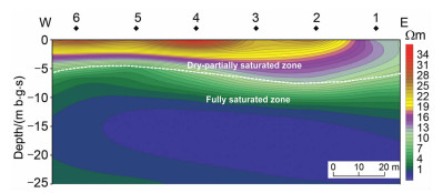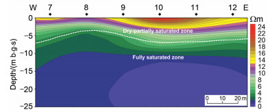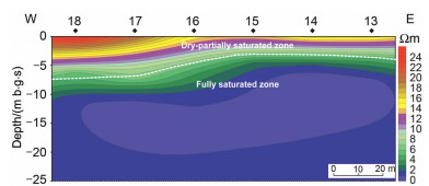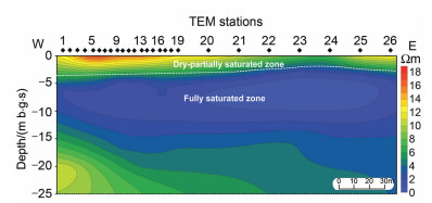 5.1.2 Geoelectrical cross-sectionsAs shown in Fig. 1, the TEM profile (P1) was taken at the desert area to the north of the pyramid. The cross-section obtained along this profile shows a similar conductivity behavior along the whole profile as shown in Fig. 7. It suggests a dry to partially saturated surface layer extended to 3~4 m depth, followed by a fully saturated zone. So, the water level, shown by the white dashed line, could be inferred at a depth of 3~4 m b. g. s along this profile.