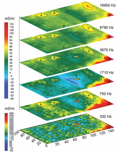 The maps obtained at frequencies 19950, 8790, 3870, 1710 Hz show similar conductivity behavior with identical convened conductivity values ranging from -60 to +124 mS/m. Also, these maps exhibit a number of well resolved high conductivity anomalies (a, b, c and d) which may be related to clay bodies, as well as, low conductivity anomaly (e), which may be attributed to near surface limestone or granite rock body. Besides, another high conductivity anomaly (f) has been firstly appeared at frequency 8790 Hz and increased in intensity with depth.