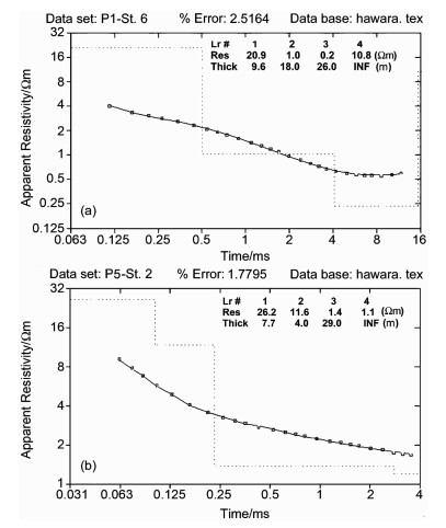 Fig. 5 Sounding curves and the corresponding models obtained from the TEM data inversion at (a) station no.6(profile P1) and (b) station no.2(profile P5) |