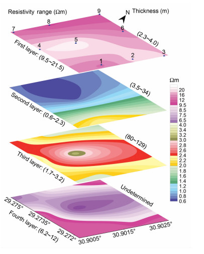 Fig. 6 Resistivity distribution maps as obtained from the TEM data inversion at the cultivated land site |