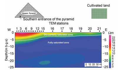 The TEM profile (P2), shown in Fig. 8, was measured to the south of the pyramid. It started at the southern entrance of the pyramid and extended eastward to cover the nearby part of the cultivated land. Screening of the subsurface water level (lower boundary of the surface layer) along this profile reveals that the water level (white dashed line) could be inferred at about 2 m depth at the cultivated land, and at about 6 m depth at the entrance of the pyramid.