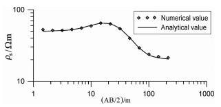 模型1; 三层层状大地,第一层电阻率50Ωm,厚度为5m;第二层电阻率100Ωm,厚度为10m;第三层电阻率20Ωm.供电电极在地面,测量装置采用对称四极,解析解采用数字滤波法计算,数值解与解析解对比最大相对误差为4.86%,见图 3.