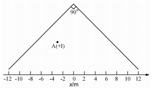 模型2; 如图 4所示,为一90°角域二维山脊地形,均匀介质,电阻率为10Ωm,电源点在地下,位于x=-3m处,在图中用A(+I)表示.表 1为地表电位数值解与解析解的对比,最大相对误差为2.9%,平均相对误差为0.66%.