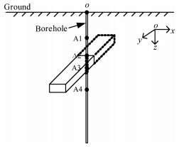 模型3; 模型如图 5所示,异常体为一长10m、宽4m、高2m的长方体,走向为y方向,顶部埋深6m,电阻率为10Ωm,背景电阻率为200Ωm,井直立,穿过异常体中心,图中用A1,A2,A3,A4来标示供电点.图 7为供电点置于井内深度h=3m、h=6m、h=8m、h=12m时地表电位异常等值线图,虚线框标出异常体在地面的投影.由图中可以看出,当供电点在异常体上方时出现负异常;当供电点在异常体下方,在低阻体边界处出现两个正异常极值,可以清楚地看出低阻异常体的位置.