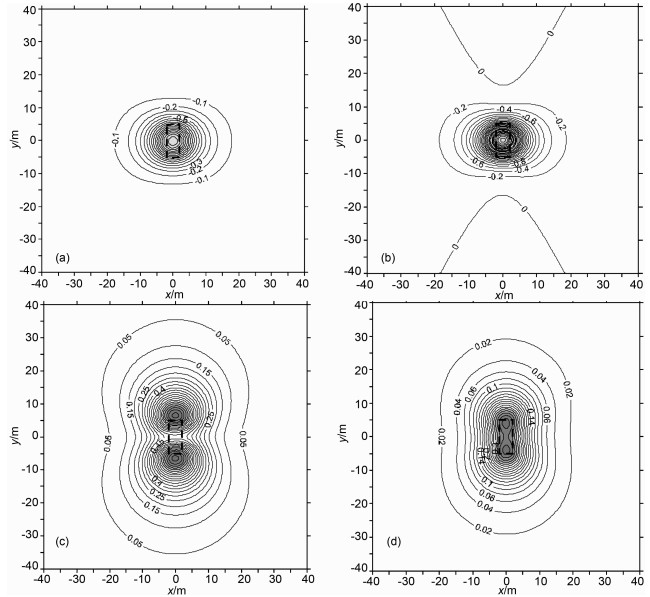 图 8 倾斜井地面电位异常等值线图(等值线上数字单位为V) Fig. 8 Ground potential anomaly contour section for the deviated well model (unit: V) (a)h=3.5m; (b)h=6m; (c)h=8m; (d)h=11m. |