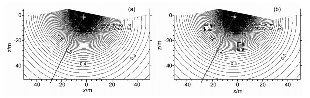 模型5; 模型在x方向有地形起伏.如图 9所示,图中用粗线和十字标记分别标识井和供电点的位置,井的方向同模型4,井轴与z轴夹角为30°,背景电阻率为20Ωm.图 9a为均匀大地情形下xz断面的电位等值线图;图 9b为含有异常体情形下xz断面的电位等值线图,其中左上的虚线方框所在位置是一4m×4m×4m低阻体,电阻率为1Ωm,右下的虚线方框所在位置是4m×5m×6m的高阻体,电阻率500Ωm.由图中可以看出,与均匀大地的情形相比,异常体的存在使电位等值线的分布发生改变,低阻体所在位置与背景区域相比是电位分布低梯度区,低阻体上的电位梯度小,等值线稀疏;反之,高阻体上的电位梯度大,等值线密集.