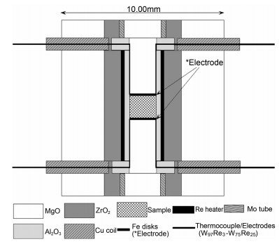 The high-pressure and high-temperature experiments were performed using a KAWAI type multianvil high-pressure apparatus USSA-5000 at the Institute of the Earth's Interior (ISEI), Okayama University. Fig. 1 shows a schematic cross-section of the sample assembly for the electrical conductivity measurements. A MgO + 5% Cr2O3 octahedral pressure medium of 10 mm edge length was used and a 4.0 mm diameter hole was drilled in it to accommodate a heater of Re two-foil with 4.20×10.02 mm width and 0.025 mm thickness. The tungsten carbide cubes with edge length of 31 mm and truncation of 4.0 mm, and a pyrophyllite gasket of 1.40 mm in thickness were used. Temperature of sample was monitored using two pairs of W97 Re3-W75 Re25 thermocouple with 0.125 mm diameter, which were mechanically connected to each Fe electrode in contact with the sample. The thermocouples were also used as lead wires for conductivity measurement. The uncertainty of temperature values caused by temperature gradients was estimated to be less than 50 K in the sample chamber. The generated pressure was calibrated at ambient temperature using phase transition of Bi (2.55 and 7.7 GPa), GaAs (18.3 GPa) and GaP (22.6 GPa). The relative uncertainty in pressure was estimated to be±lGPa. Before measurements, the sample and all of other parts were cleaned out in acetone using ultrasonic, and then heated at 1000℃ about 12 h to remove the influence of adsorbed water in the sample assembly.