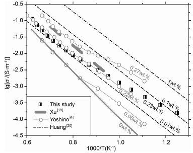 Fig. 3 Comparison of the electrical conductivity for ringwoodite with previous results. The thick dashed line from Xu (1998) [19]; The dot-dashed lines from Huang (2005)[20]; The open circles from Yoshino (2008)[4] The numbers represent water content in wt% |