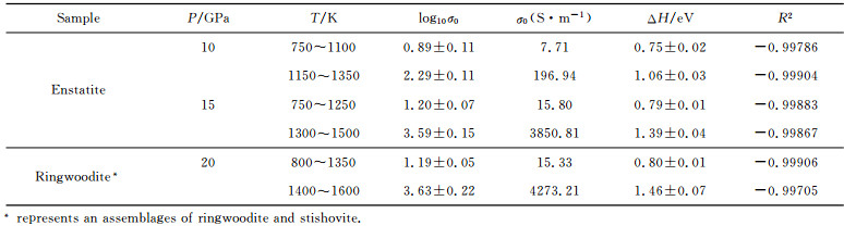 where σ is electrical conductivity, σ0 is a preexponential factor, the activation enthalpy ΔH=ΔE + PΔV with activation energy ΔE and activation volume ΔV, P is pressure, T is the absolute temperature, and k is the Boltzmann constant. The logarithmic conductivity of (Mg0.9Fe0.1) SiO3 enstatite at different pressure is plotted against the reciprocal temperature in Fig. 2. The electrical conductivity of enstatite increases slightly with increasing pressure from 10 to 15 GPa. Activation enthalpy (ΔH) and pre-exponential terms (ο0) resulting from fitting Eq.(2) to the data are summarized in Table 1.