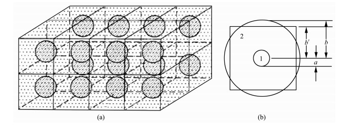 考虑到White球状Patchy模型中孔隙介质空间周期排列的特点, 可以取示意图中任意一个空间周期内的立方体作为特征单元, 通过研究纵波在单元体中特性获知纵波在整个Patchy模型中的传播特性.为了研究的方便, White用图 1b所示的方法把单元体用一个含两种不同孔隙流体的球体来代替, 本文依旧采用这种处理方法.根据体积相等的原则等效球体半径b和立方体边长(即空间周期长度)的一半长度b'存在如下关系: