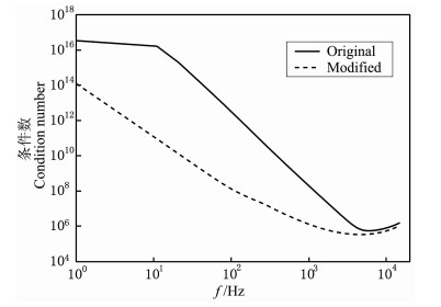 对(19)、(20)式进行变形得到A1=-A2、A3=-A4, 然后将它们代人条件式(13)~(18)导出的方程组中, 得到与原8阶方程组等价的6阶新方程组. 图 2中的modfed曲线表示新方程组的条件数, 可以看到经过缩减处理, 新方程组的条件数较原方程组的明显减小, 尤其在1~1000的低频段.对于新的方程组用matlab中解线性方程组的子程序可以得到理想结果.