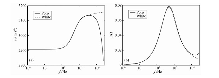 图 3a、3b是用上面数值方法得到的气-水Patchy模型中纵波的频散、衰减曲线, 图中White曲线表示用White公式得到的模型结果.Poro曲线表示用本文求解孔隙弹性方程方法得到的结果可以看到在低频段用两种方法得到的速度和衰减符合得很好, 但随着频率的升高, 两种方法的速度结果差异变得明显, 当频率超过2×104 Hz, White公式的衰减值继续下降, 而孔隙弹性力学方法得到的衰减值却开始上升.分析其原因, 对比弹性结构的声子晶体的原理[17], 由于空间的周期排列结构使得White球状Patchy模型变成了孔隙弹性的声子晶体, 当外加载荷的频率升高, 孔隙介质内的波长达到和特征单元的尺度相当时, 模型中传播的纵波进入了声子晶体的能量禁带, 所以在一定频率后出现纵波速度随频率升高而速度降低, 逆品质因子在出现第一个峰值后的一段频率后又出现衰减值增大的现象, 这和周期成层Patchy模型的结果[13]类似.由于White公式是在低频假设前提下得到的, 所以当模型内的纵波波长和特征单元尺度相当时, 低频假设已经不满足, 此时再用White方法求波速和衰减是不合理的, 而本文求解孔隙介质力学的方法可以适用于高频