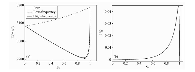图 4a是气-水Patchy模型中纵波速度随含水饱和度(Sw)的变化情况, 其中Low-frequency曲线表示低频极限情况下用等效流体理论[18]和Gassmam理论求得的Patchy模型中纵波速度, High-frequency曲线是高频极限情况下用等效流体理论和Hill方法求得的纵波速度, 它们的具体算法可以参考附录B.从图中可以看出在指定50 Hz的低频情况下用等效流体理论求得纵波极限低频速度和用严格孔隙介质理论求得的结果差异很小.用等效流体理论和Gassmam理论估计流体Patchy饱和岩石中的纵波速度完全能够满足当前地震勘探的要求.图 4b中衰减量随含水饱和度的关系显示, 指定的地震频率下, 衰减峰值出现含水饱和度0.985附近, 其最大峰值约为0.045, 最大衰减峰值位于实际地震衰减观测值的区间内[1].此外数值结果说明在含水的孔隙流体中混入少量的气体会引起地震频段下纵波较大的衰减.