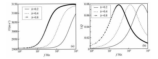图 3 气-水Patchy模型中纵波频散(a)及衰减(b) Fig. 3 Dispersion (a) and attemuatiom (b) of P wave in model with gas-water patchy saturation |