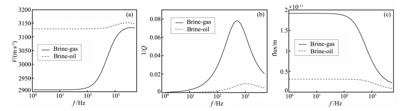 从图 6的三个图可以看出, 在两种不同的球状Patchy模型中, 在油、气含量相同的情况下, 由于油、水的体积模量的差异比油、气的差异要小, 在外界压力相同的情况下, 油、水孔隙流体之间引起的压力差比油、气孔隙流体之间的压力差要小, 从而使得油-水Patchy模型的流体流量小.又因为孔隙流体的流动影响介质的衰减和频散, 所以油-水Patchy模型中的纵波频散和衰减要比气-水Patchy模型中的小.从两种模型的频散和衰减量差异可以看出孔隙介质中的流体流动对纵波的频散和衰减影响很大.